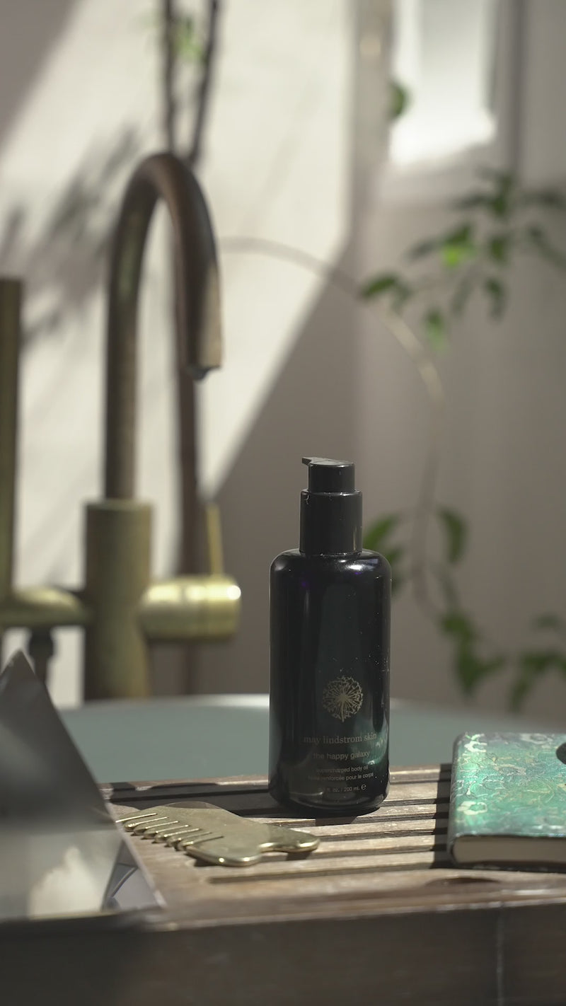 After shaking bottle, dispense 4-6 pumps into wet hands, pressing between palms to trigger the vitamin actives. Massage this cerulean elixir from toes to hips, repeating generously over your upper body, and gliding over your every dip and curve with a firm, loving touch.
