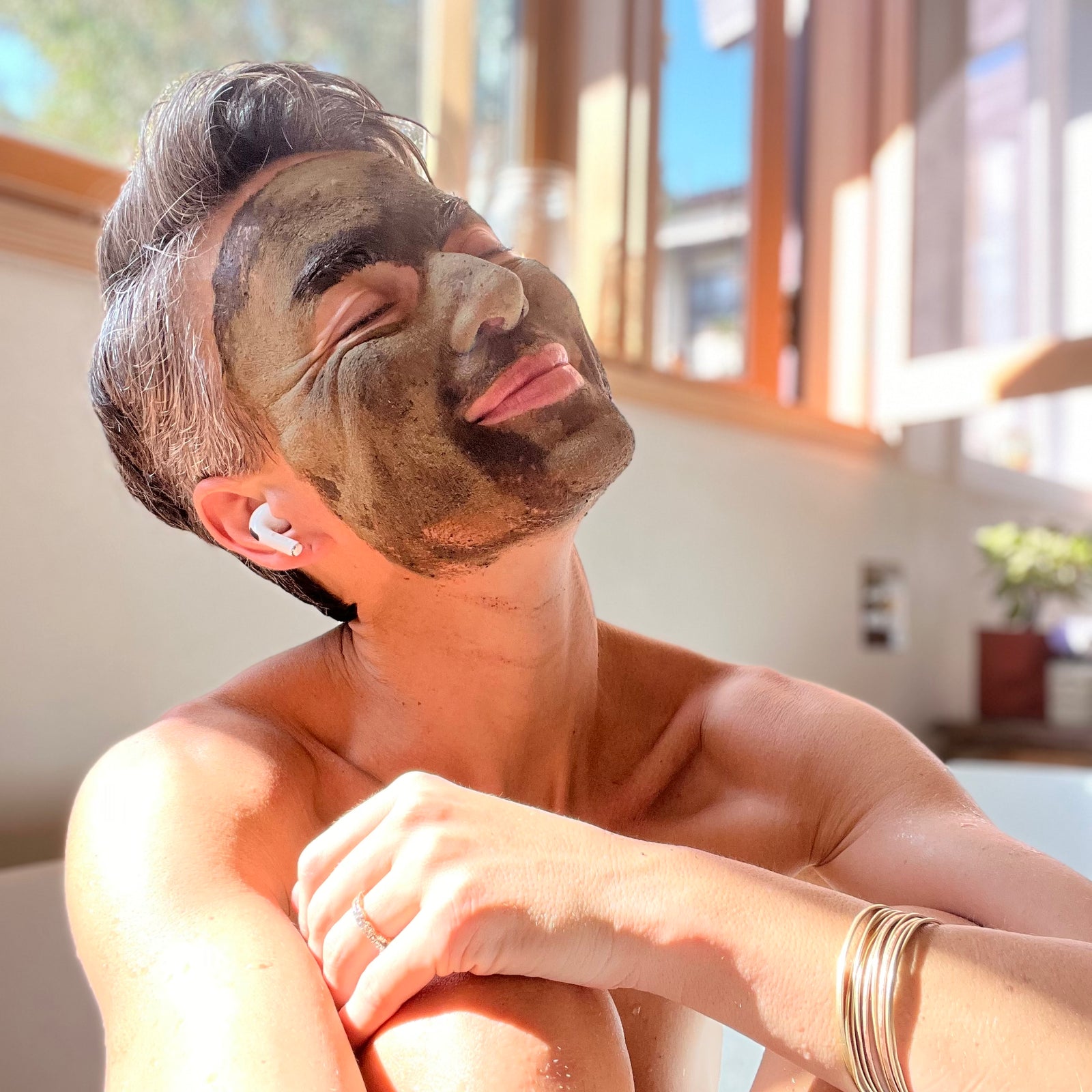 In the shower, blend 1 tsp. of The Clean Dirt with equal parts water in your palm to bring to a fizzing mousse consistency. Add in one more spoonful of The Honey Mud and blend to give your treatment a luscious, glow-inducing boost. Massage into damp skin with the pads of your fingertips, allowing this duo to sit for a few minutes. Face into the water to rinse the formula away easily, massaging as you go. Finish with a blend of The Blue Cocoon, The Youth Dew, and The Jasmine Garden, massaging all three as one into your warm, wet skin for deepest possible absorption. Before you exit the shower, hydrate with The Happy Galaxy from head to toe, massaging generously into fully wet skin.